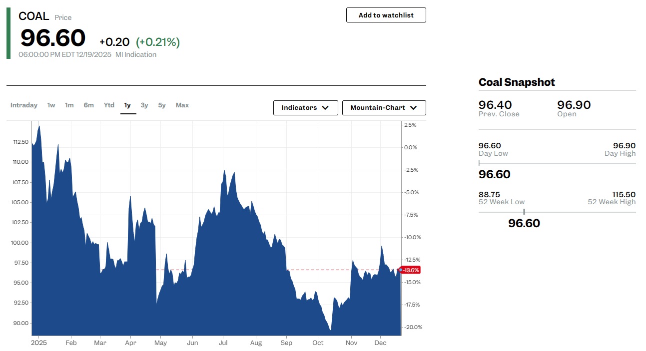 Tham khảo giá than ngày 21/12/2025: 96.60 đô la Mỹ/tấn, tăng 0.20 đô la Mỹ (+0.21%)