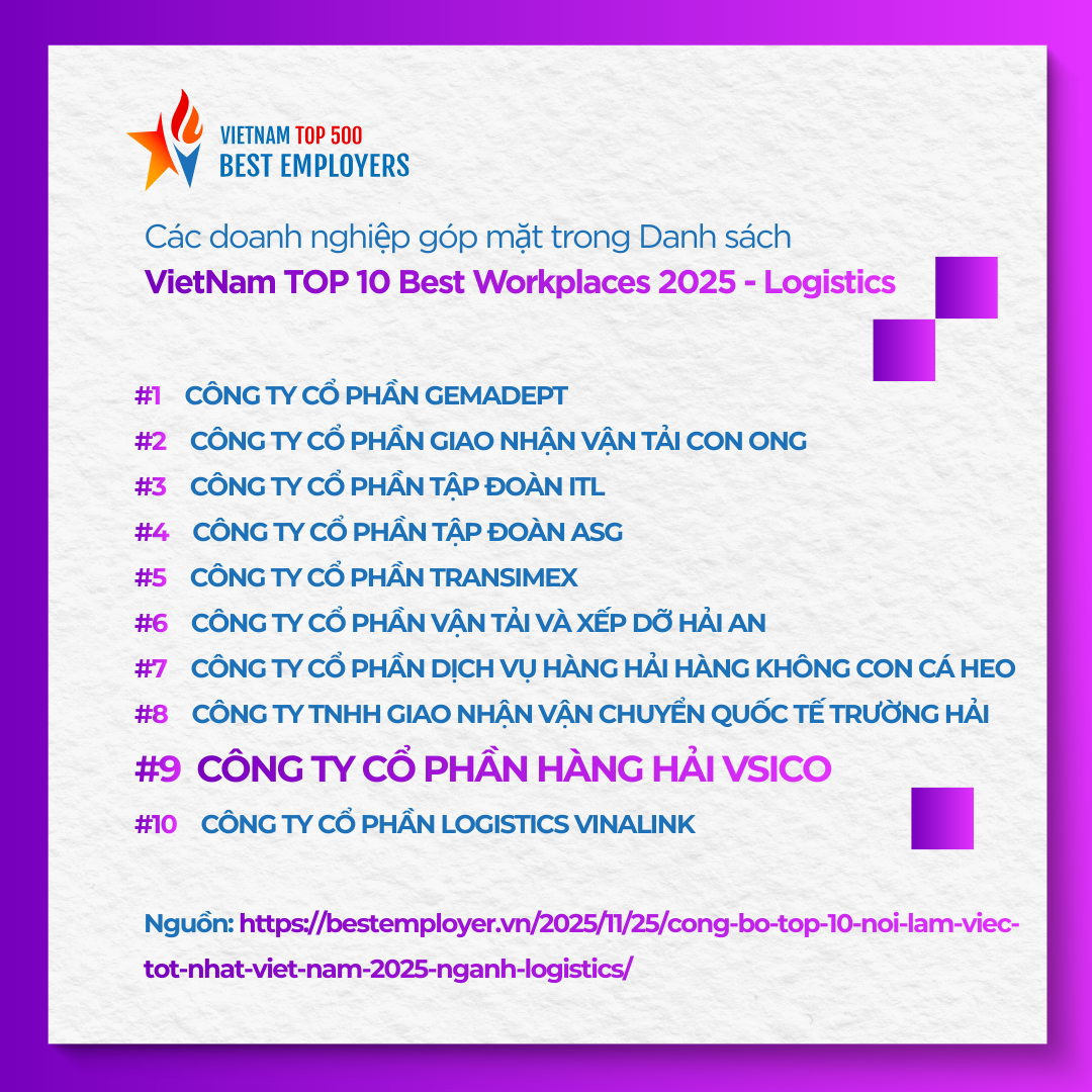 Xin chúc mừng VSICO lọt TOP10 doanh nghiệp Logistics Việt Nam có nơi làm việc tốt nhất