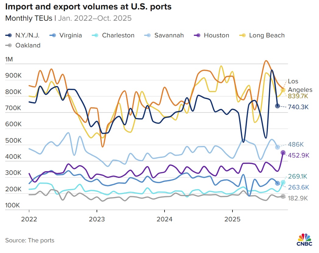 “Khi nhập khẩu đồ nội thất giảm 33%, còn đồ chơi — vốn thường tăng 40–50% trước mùa lễ hội — chỉ tăng 17%, điều đó cho thấy các nhà bán lẻ đang đặt cược vào mùa mua sắm yếu nhất trong nhiều năm,” ông nói.